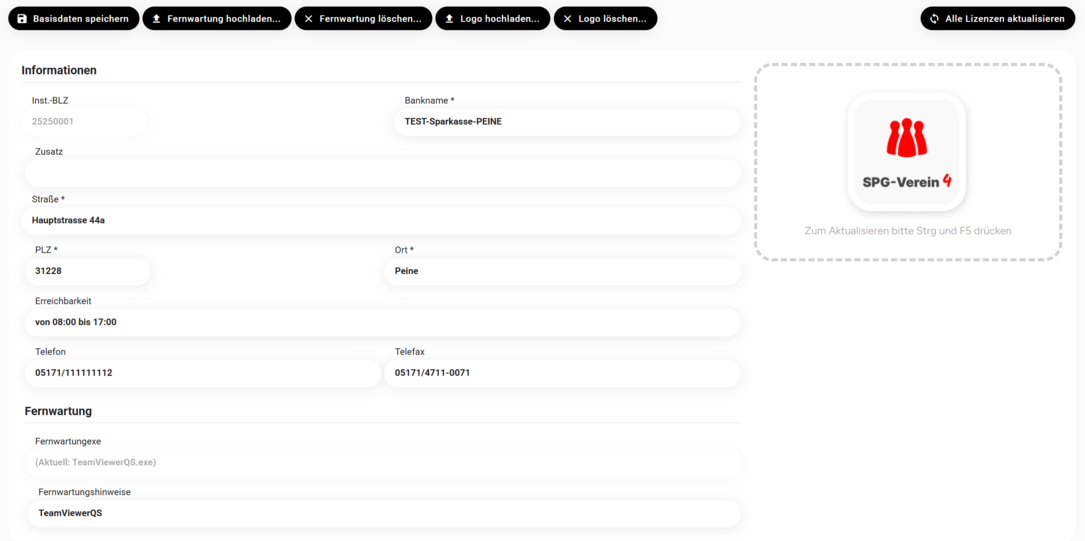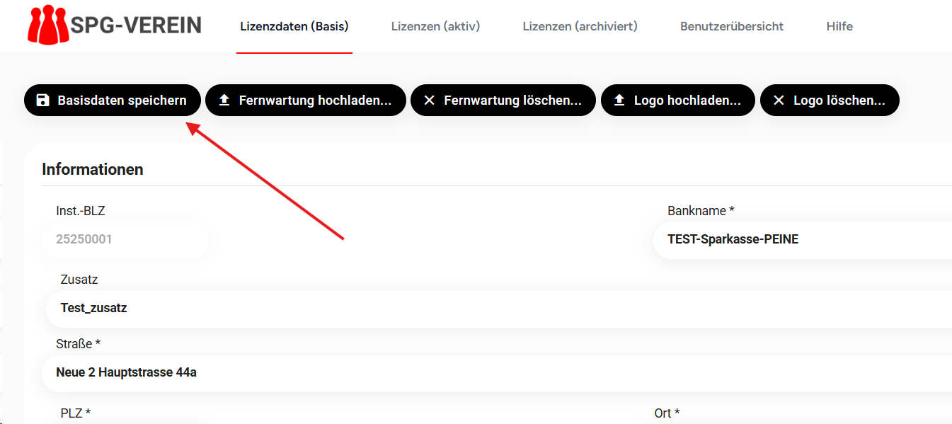 Im Bereich Lizenzdaten (Basis) können die grundlegenden Informationen einer Institution verwaltet werden, die in SPG-Verein 4 unter Lizenzinformationen angezeigt werden.