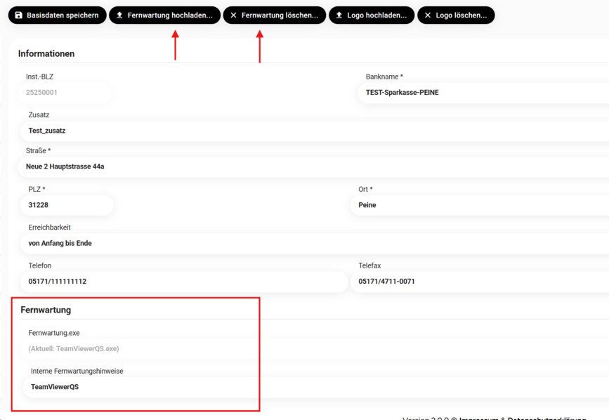 Bereich Fernwartung verwalten mit hinterlegter Fernwartungsdatei und Optionen zum Hochladen oder Löschen.
