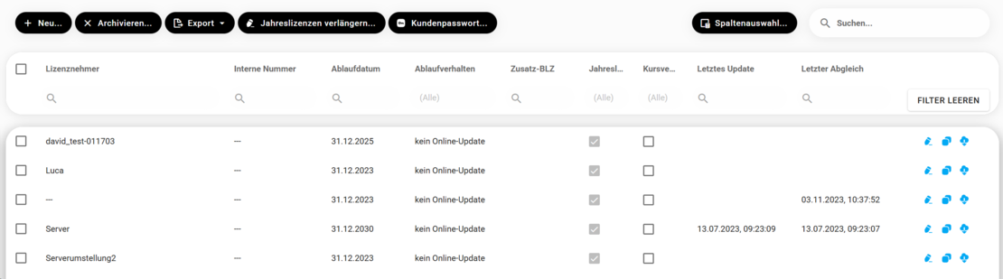 Spaltenfilter: In den jeweiligen Spalten können Sie spezifische Filter setzen, um die Lizenzen nach bestimmten Kriterien zu filtern (z. B. Lizenznehmer, E-Mail, Ablaufdatum).