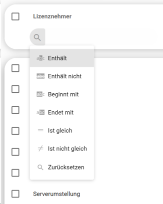 Erweiterte Filteroptionen: Beim Bewegen der Maus über das Lupen-Symbol in einer Spalte öffnet sich ein Menü mit verschiedenen Filteroptionen, darunter:
