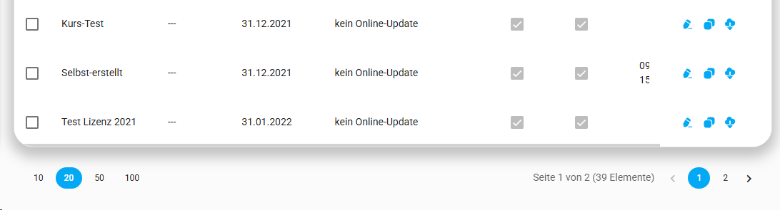 Links können Sie auswählen, wie viele Lizenzen auf einer Seite angezeigt werden sollen. Rechts sehen Sie die Anzahl der verfügbaren Seiten.