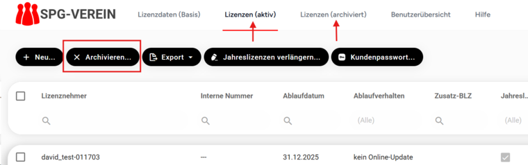 Sie können markierte Lizenzen archivieren. Diese entspricht dem Löschen einer Lizenz. Sie können eine archivierte Lizenz jederzeit wieder aktivieren.
