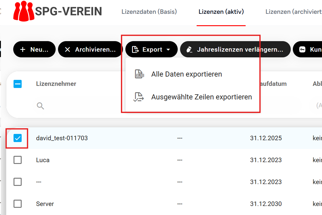 Mit dieser Funktion können Sie Ihre Lizenzen als XLSX-Datei exportieren. Sie haben die Möglichkeit, entweder alle Lizenzen oder nur ausgewählte Zeilen zu exportieren. Die exportierte Datei wird automatisch unter dem Namen „Lizenzen(aktiv).xlsx“ im Download-Verzeichnis gespeichert.