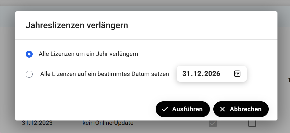 Sie haben die Möglichkeit, allen als Jahreslizenz definierten Lizenzen über den Button "Jahreslizenzen verlängern" ein neues Ablaufdatum zuzuweisen.