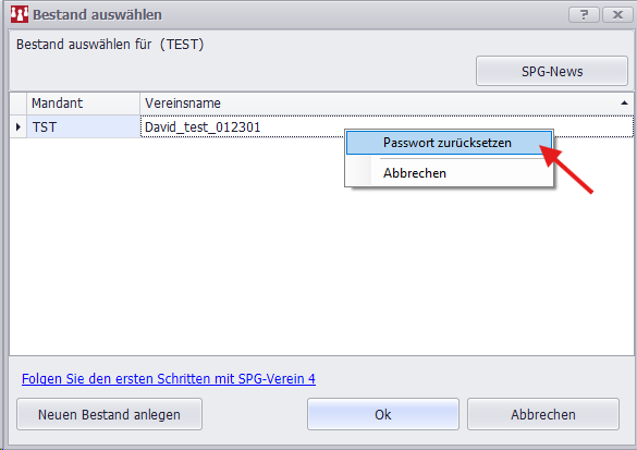Die Eingabemaske wird vom Kunden in SPG Verein über die Mandantenauswahl gestartet. Dafür muss mit der rechten Maustaste auf den Mandaten das Kontextmenü aufgerufen werden: