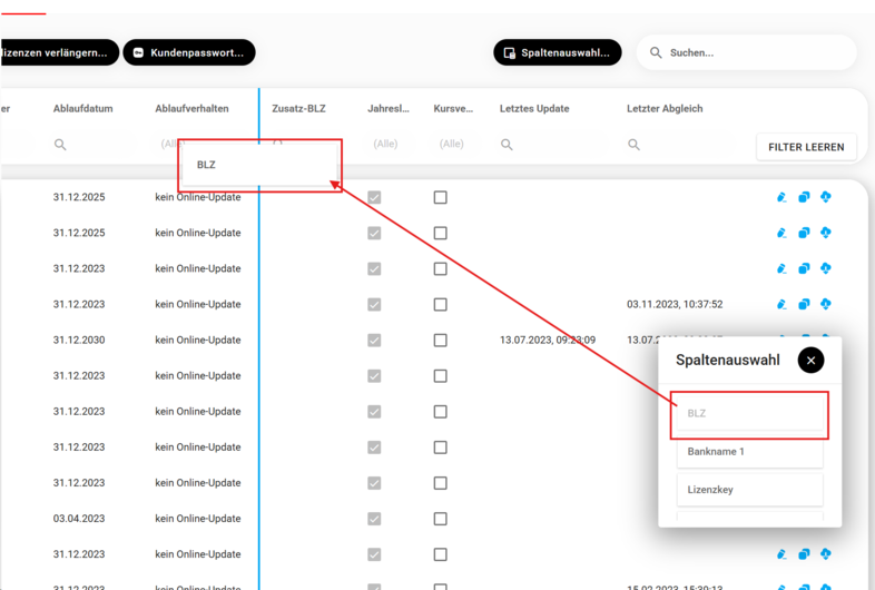 In dieser Einstellung können Sie Spalten in der Lizenz-Tabelle hinzufügen oder entfernen. Um dies zu tun, ziehen Sie einfach mit der Maus die gewünschte Spaltenbezeichnung an die gewünschte Position.