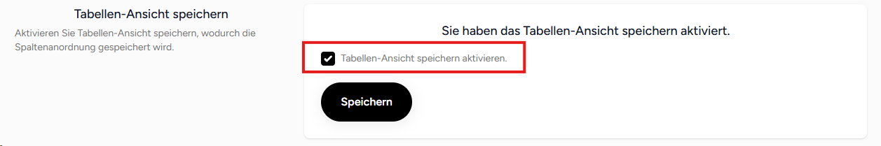 Mit dieser Einstellung können Sie festlegen, ob Änderungen an der Tabellenansicht dauerhaft gespeichert werden sollen.Wenn die Option „Tabellen-Ansicht speichern aktivieren“ aktiviert ist, bleiben Ihre individuellen Einstellungen zur Tabellenspalten (z. B. Spaltenreihenfolge, Spaltenbreite, ein- oder ausgeblendete Spalten) auch nach dem Ausloggen erhalten.Wenn die Option deaktiviert ist, wird die Tabellenansicht bei jedem neuen Login zurückgesetzt – alle Spaltenanpassungen gehen verloren.